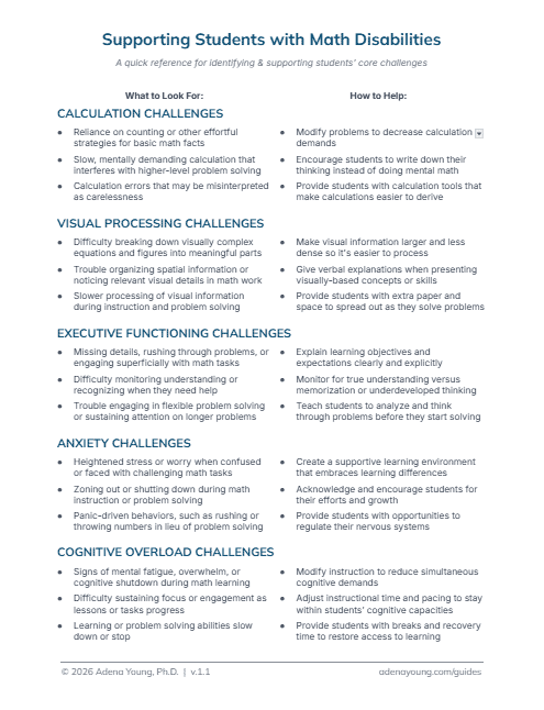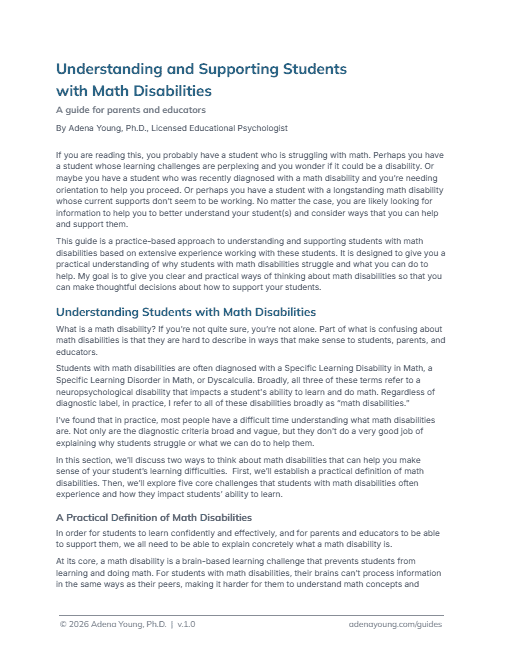 This guide is designed for families, educators, and school teams who want to better understand students with math disabilities. It offers a deeper look at why students struggle, how their challenges show up in learning, and how to provide meaningful, targeted support.